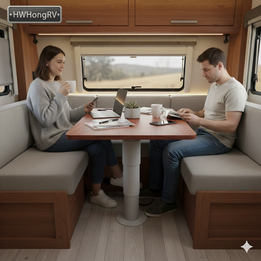 HWHongRV 电动升降桌腿可提供平稳、精确、安静的高度调节, 12V电动系统,允许用户轻松转换他们的房车或船的内部布局。